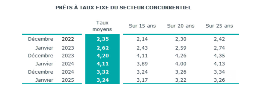 Les signaux s’amĂ©liorent progressivement sur le front des taux immobiliers en ce dĂ©but d’annĂ©e, avec une moyenne qui s’Ă©tablit Ă 3,24% selon les chiffres de l’Observatoire CrĂ©dit Logement / CSA. La tendance baissière s’intensifie mĂŞme lĂ©gèrement, passant de -7 Ă -8 points de base mensuels entre 2024 et janvier – un timing plutĂ´t inhabituel qui tĂ©moigne d’une rĂ©elle volontĂ© d’encourager le marchĂ©.